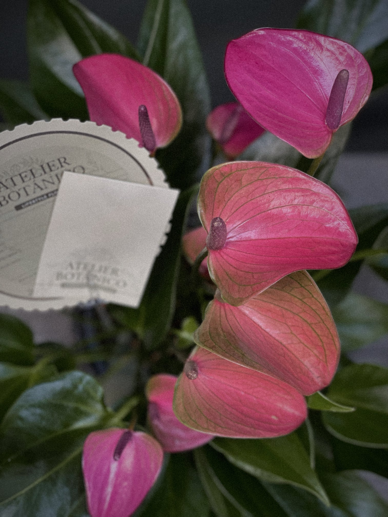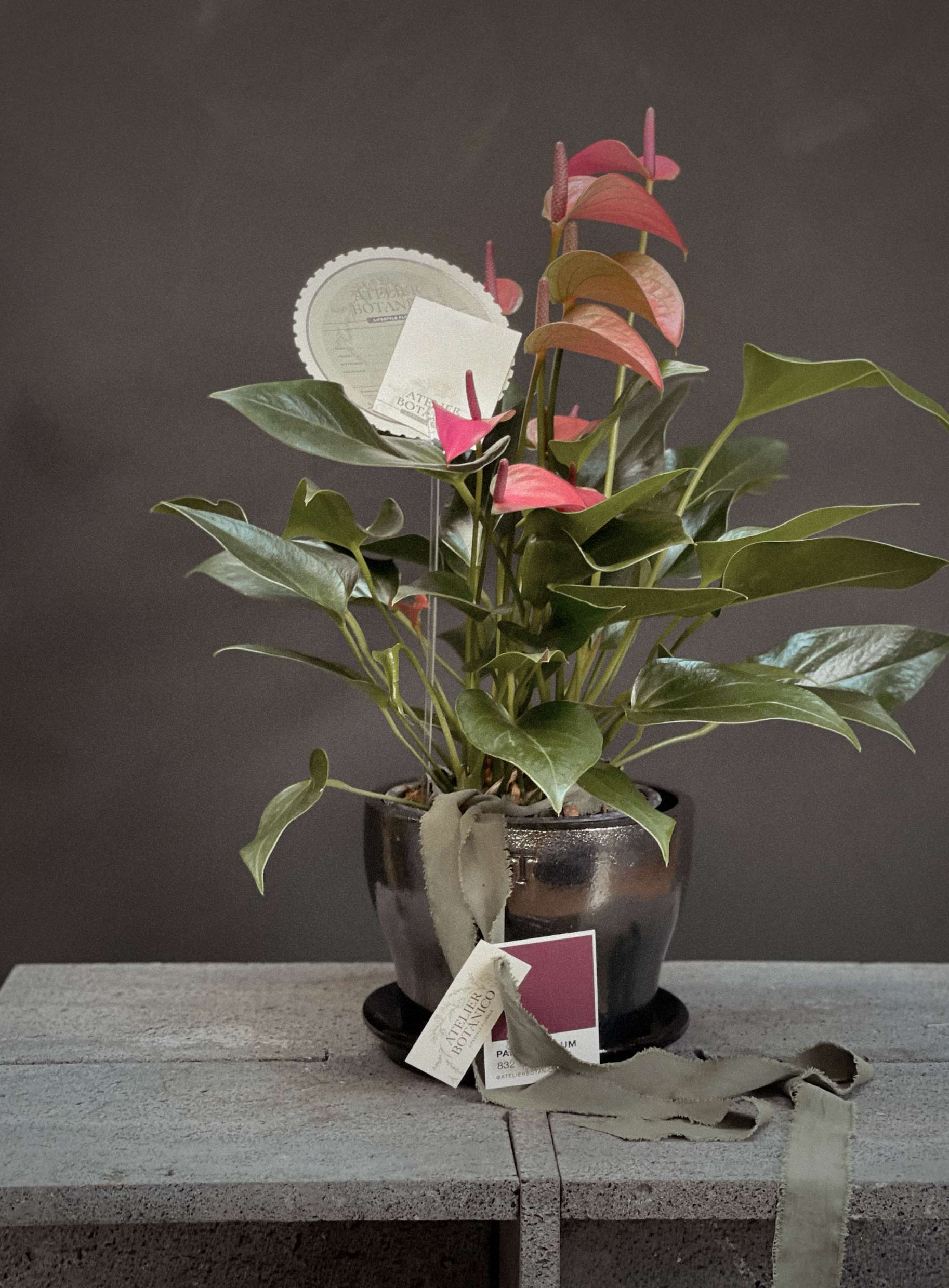 Nota: Los tonos de los Anturios pueden variar según disponibilidad. De no haber existencia de algún color en específico se sustituirá por uno similar según el mejor criterio de nuestros floristas. La maceta puede variar entre gris claro, gris medio y gris obscuro, se selecciona según el tono que mejor complemente el color del Anturio seleccionado según el mejor criterio de nuestros floristas.