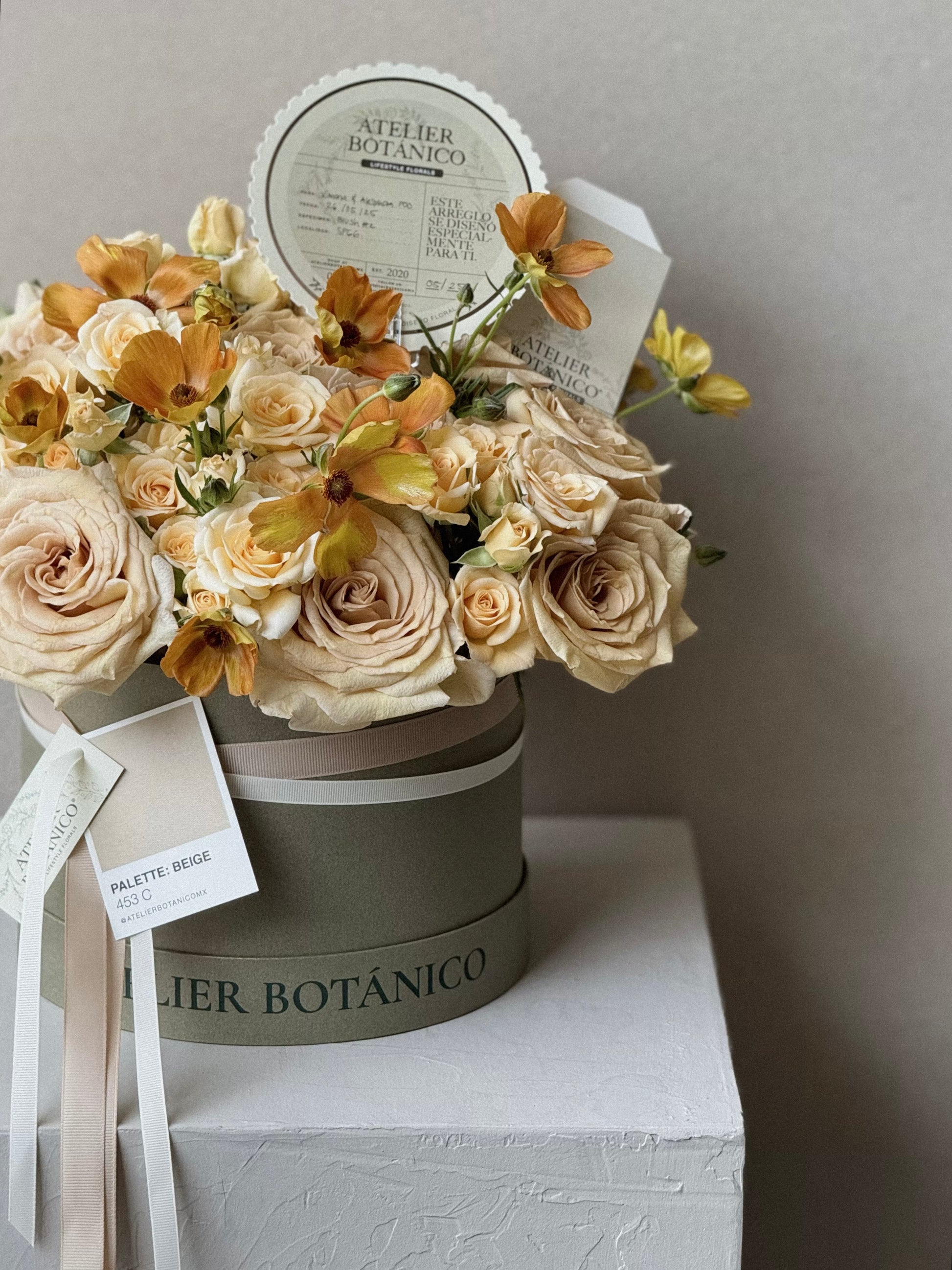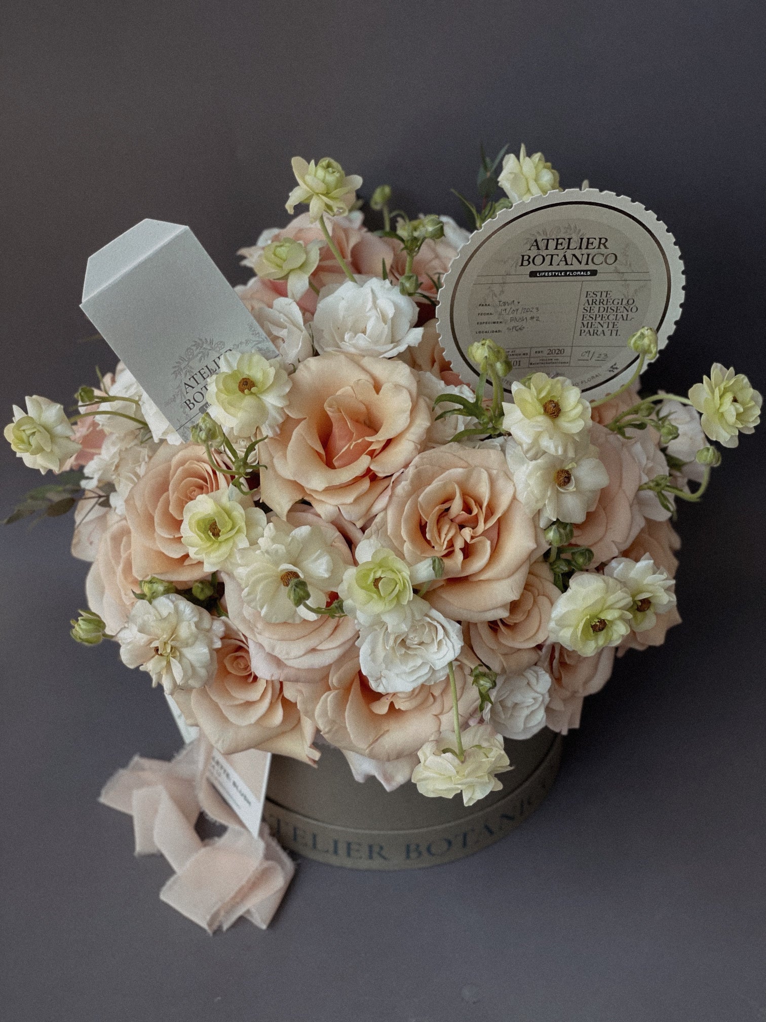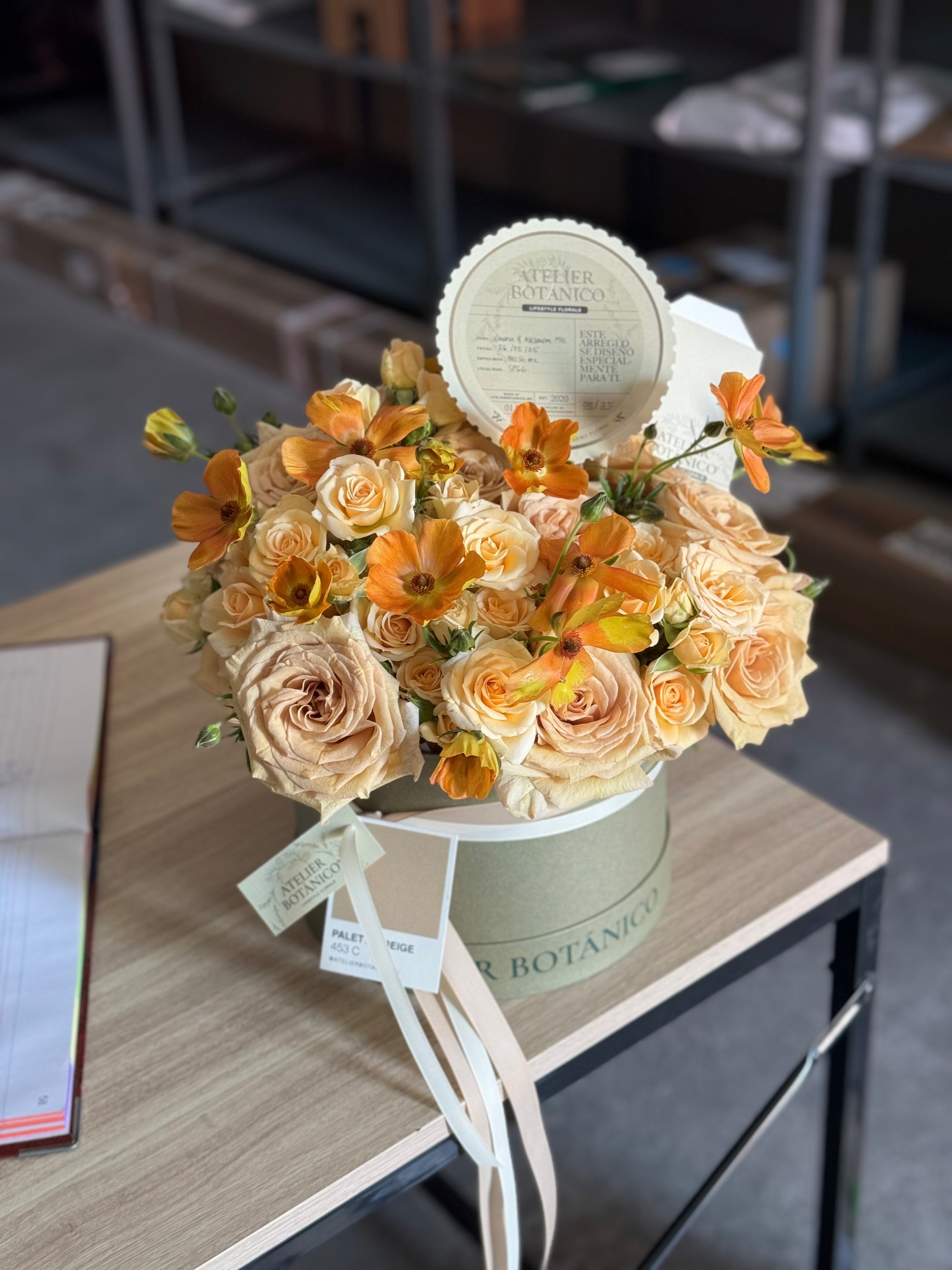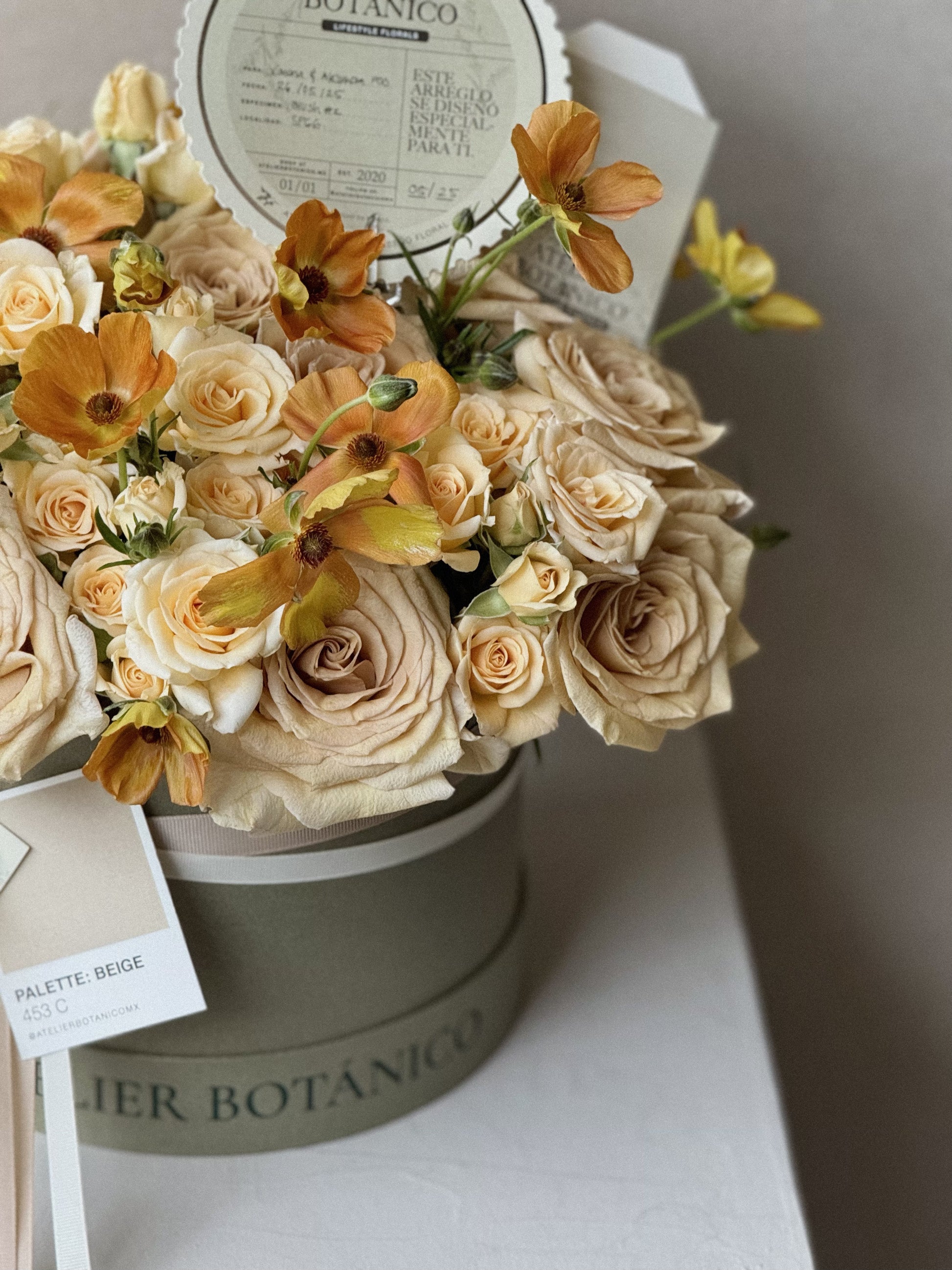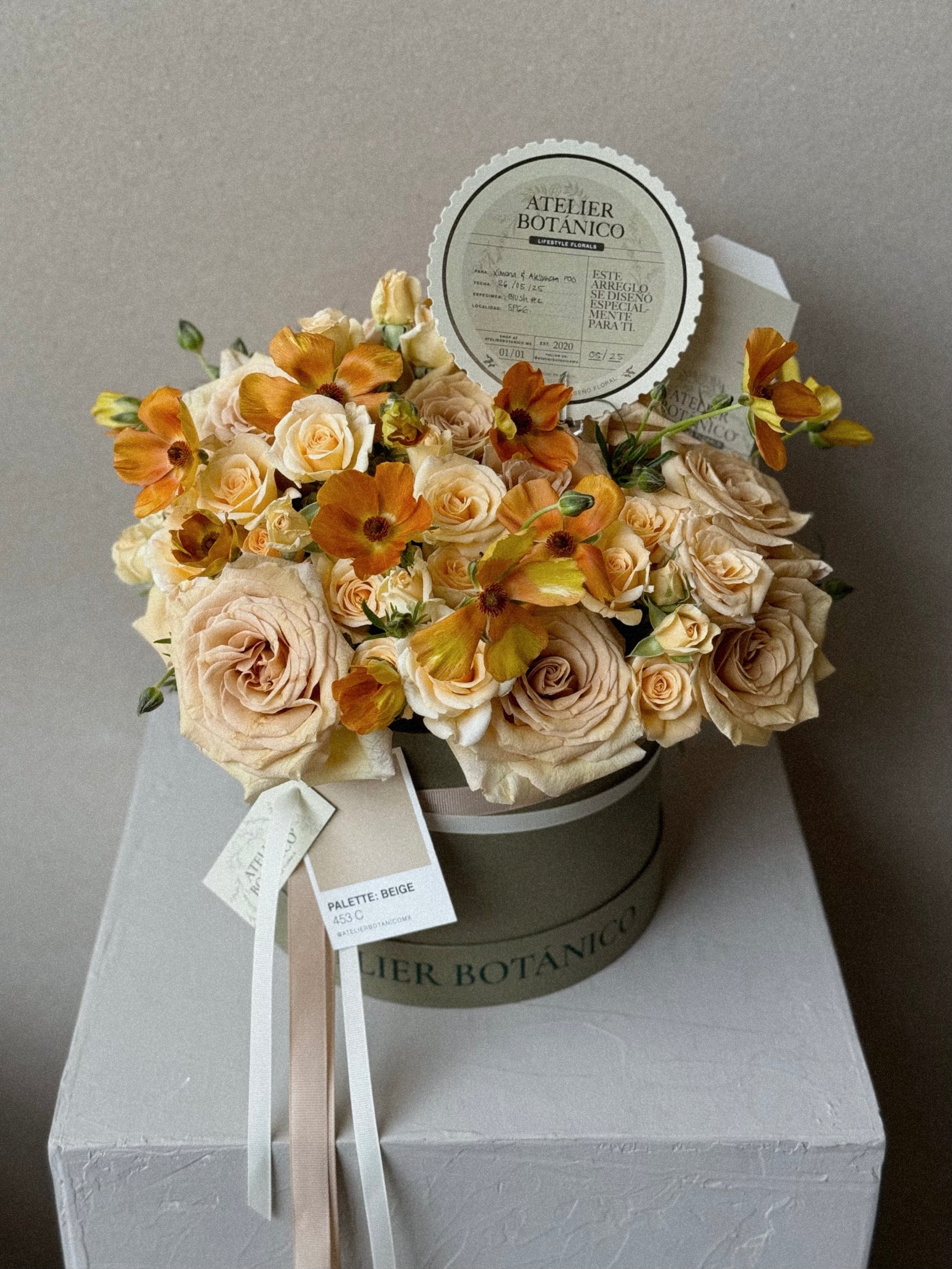 Composición de Rosas, Minirosas y Ranúnculos en tonos Melón, Naranja y Amarillo en caja Mediana Atelier Botánico.