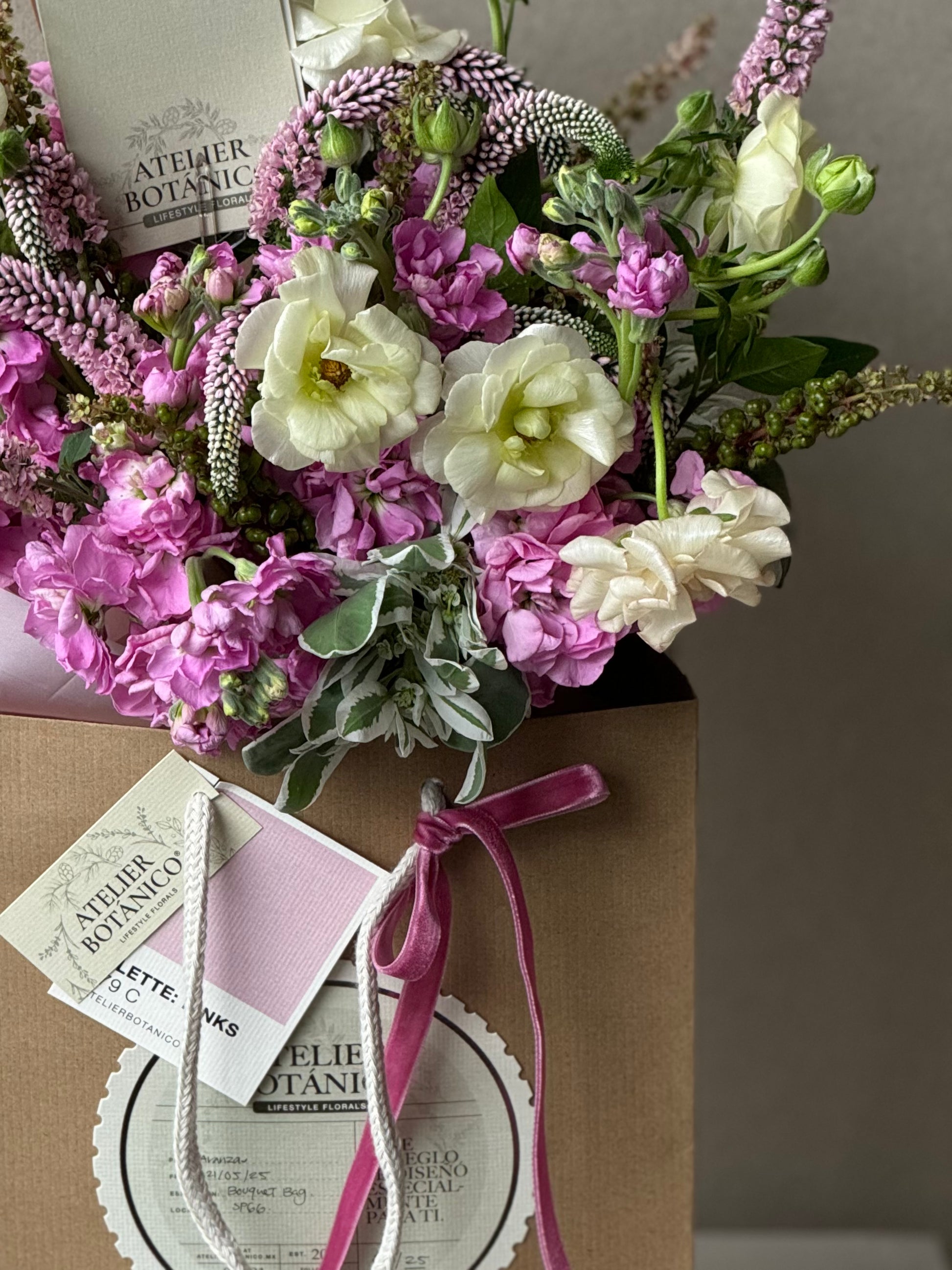 Nota: Las flores mostradas en estas imágenes son representativas. No representan las flores exactas, los tonos y composición exacta de tu bouquet. Este arreglo es completamente aleatorio y al comprarlo permites darle total creatividad y libertad a nuestras floristas de elegir la combinación de flores frescas y tonos disponibles al momento de tu compra para tu bouquet.