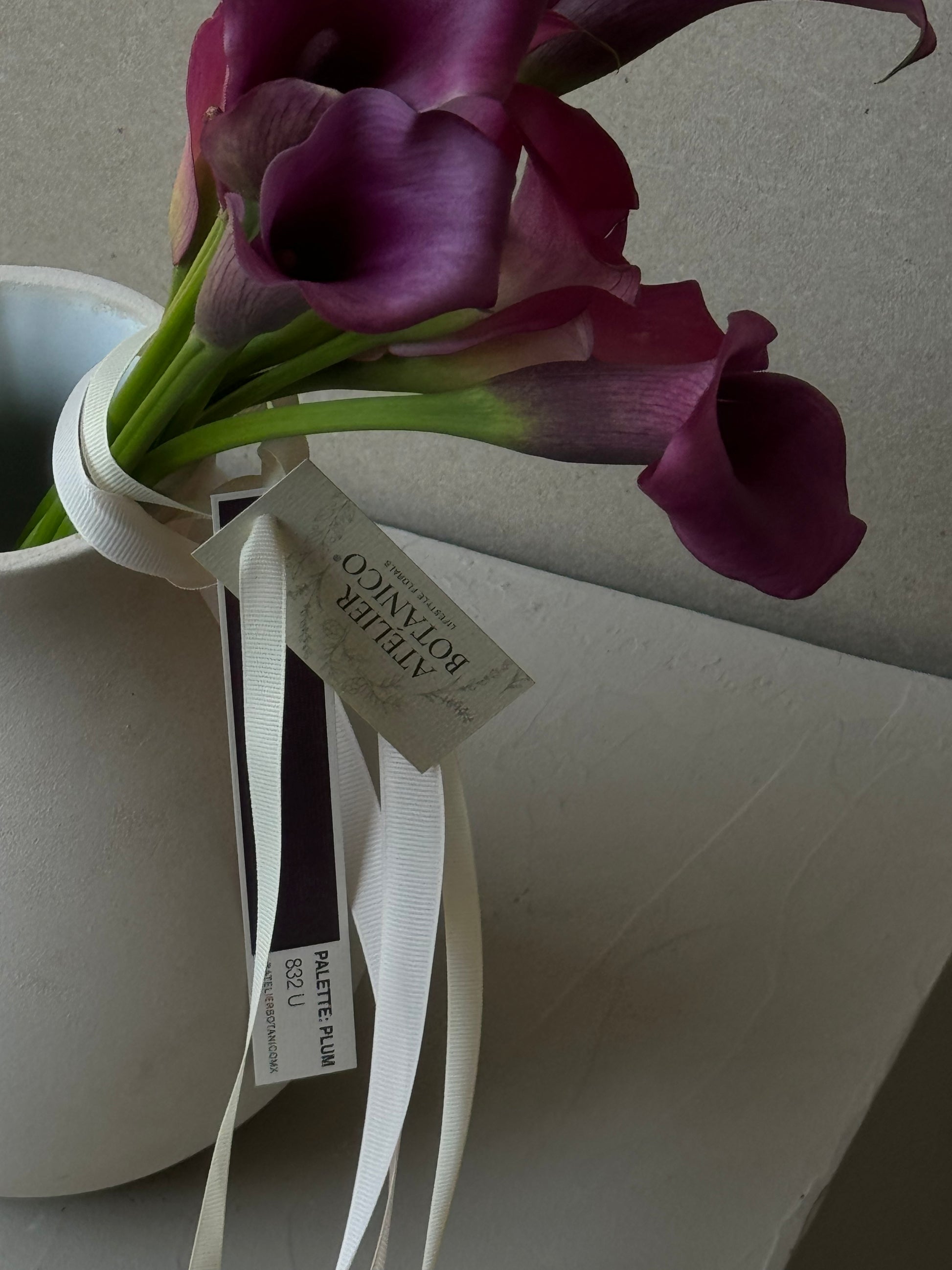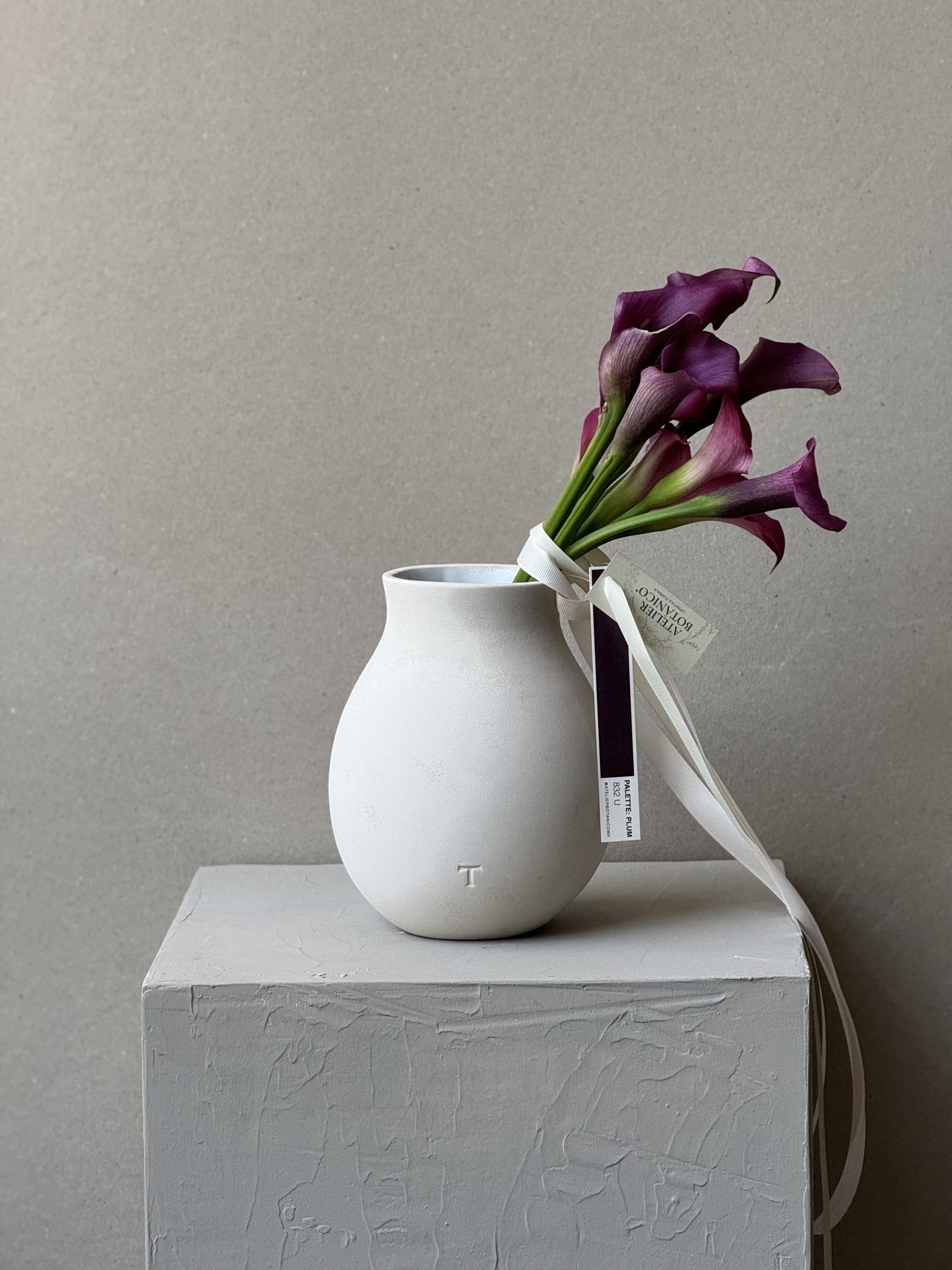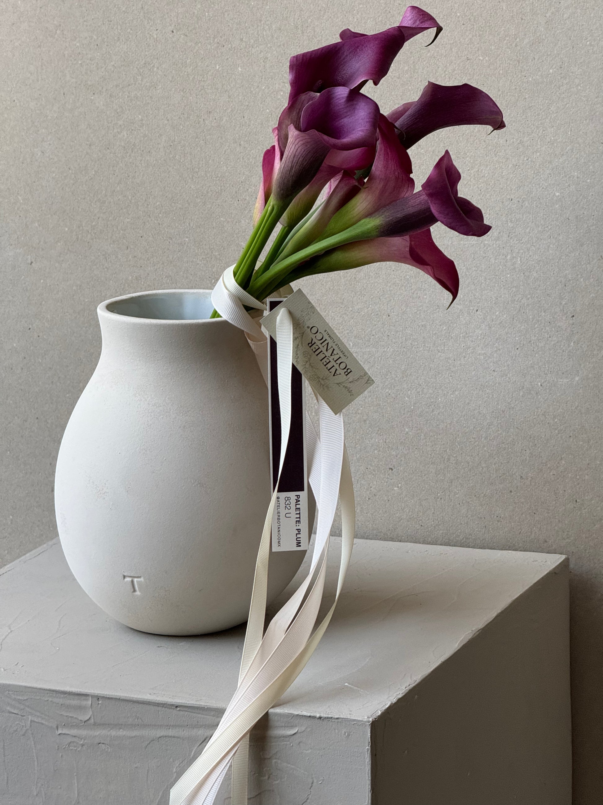 Bouquet de 8-10 Cala Lilys en color Morado Profundo. Sobre base cerámica Trinitate.