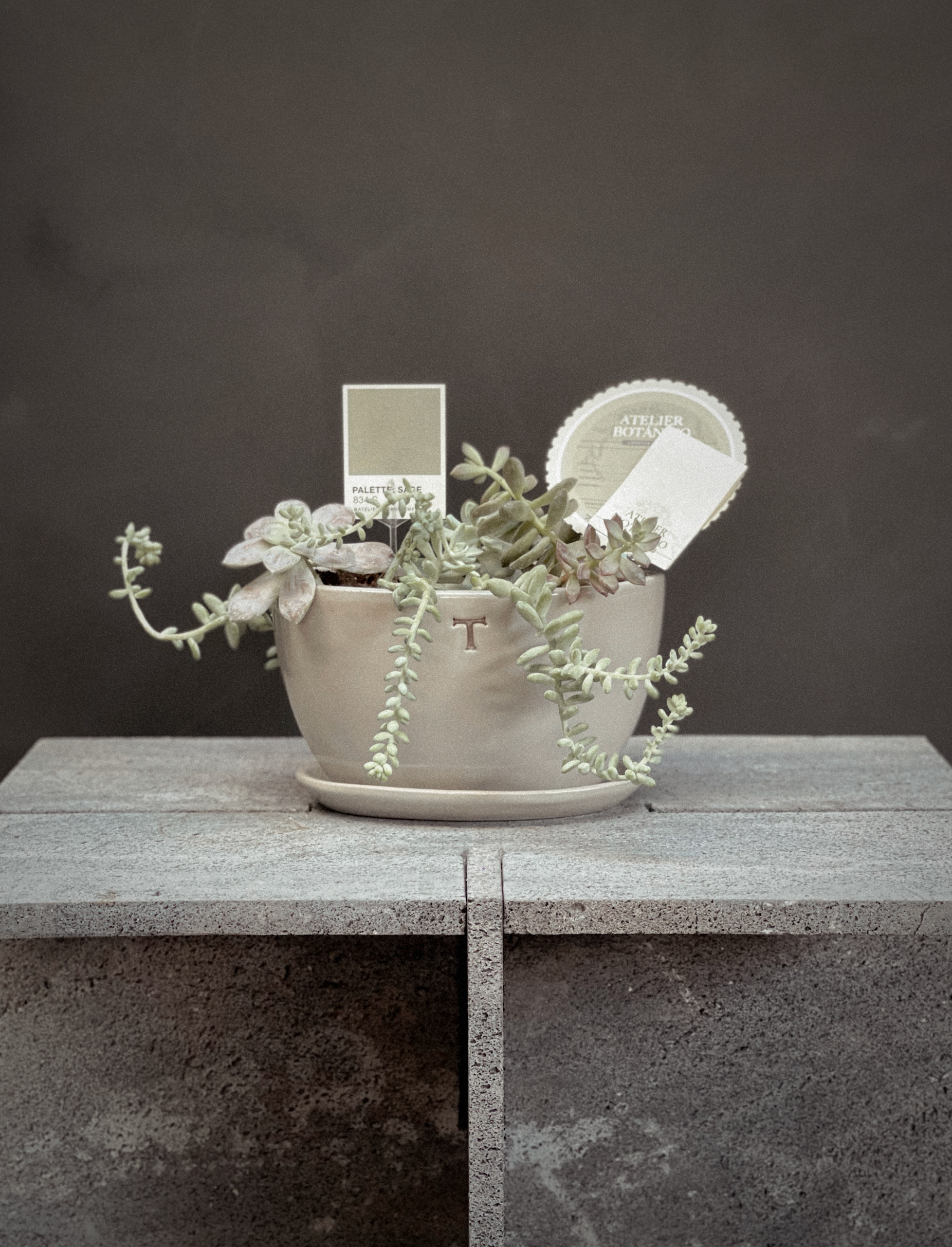 Arreglo de 4 Suculentas en maceta ovalada chica de Trinitate en color gris claro con plato.