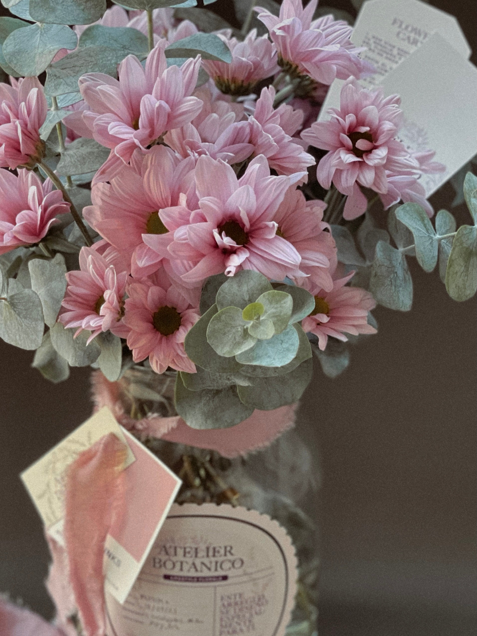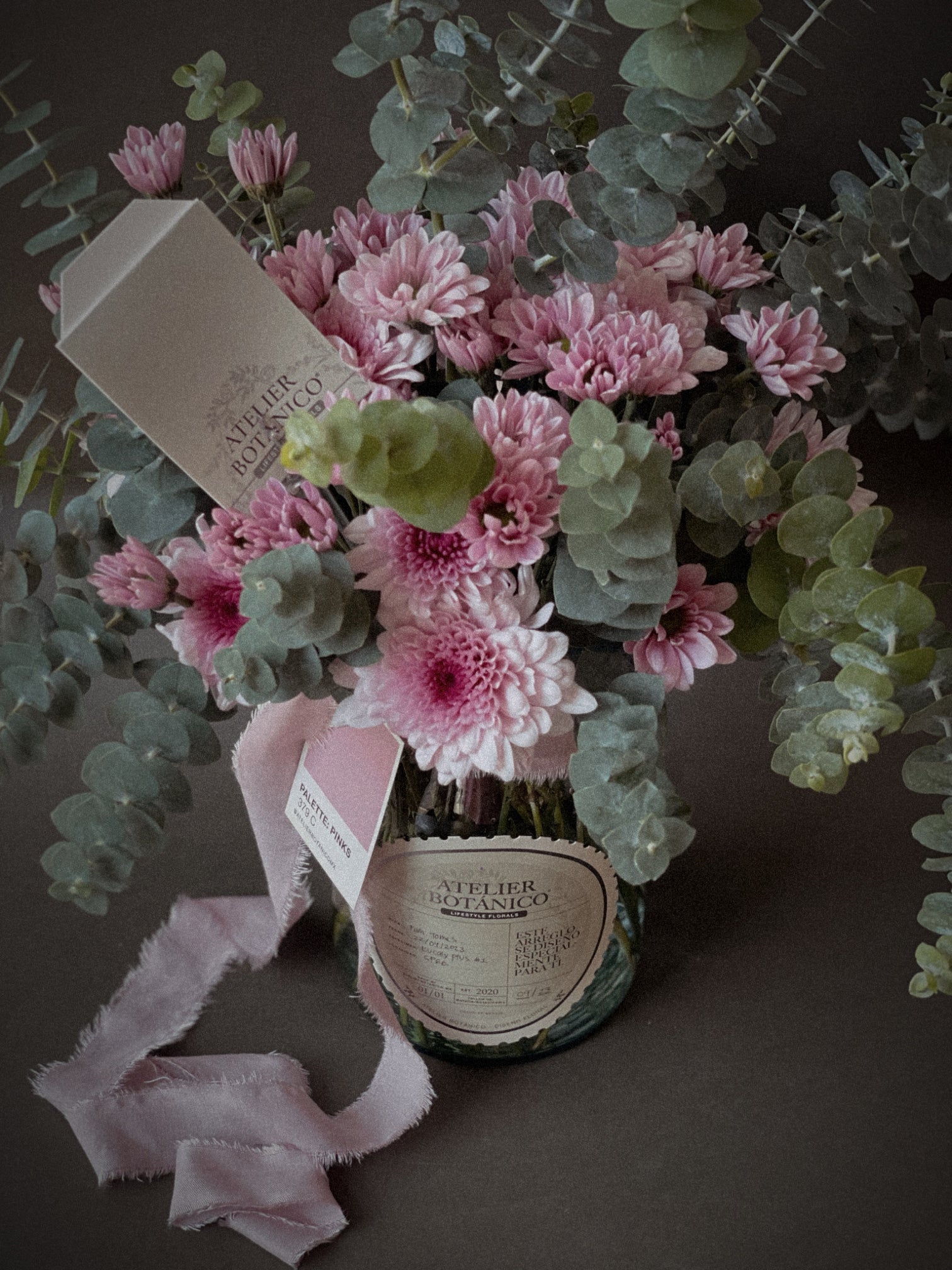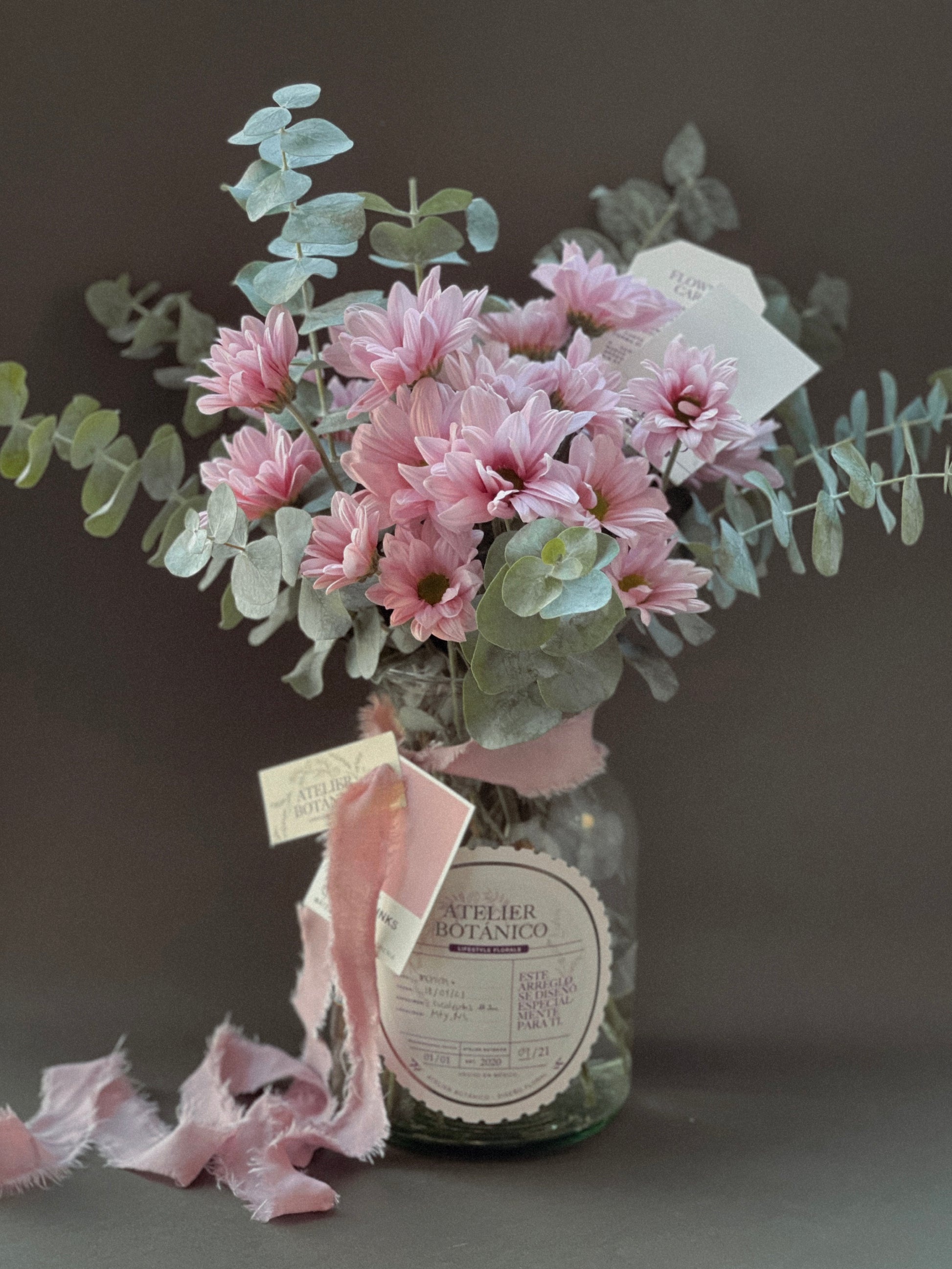 Nuestra selección de Margaritas color Rosa Pastel y Eucalipto montadas en Jarrón de Vidrio Atelier Botánico.