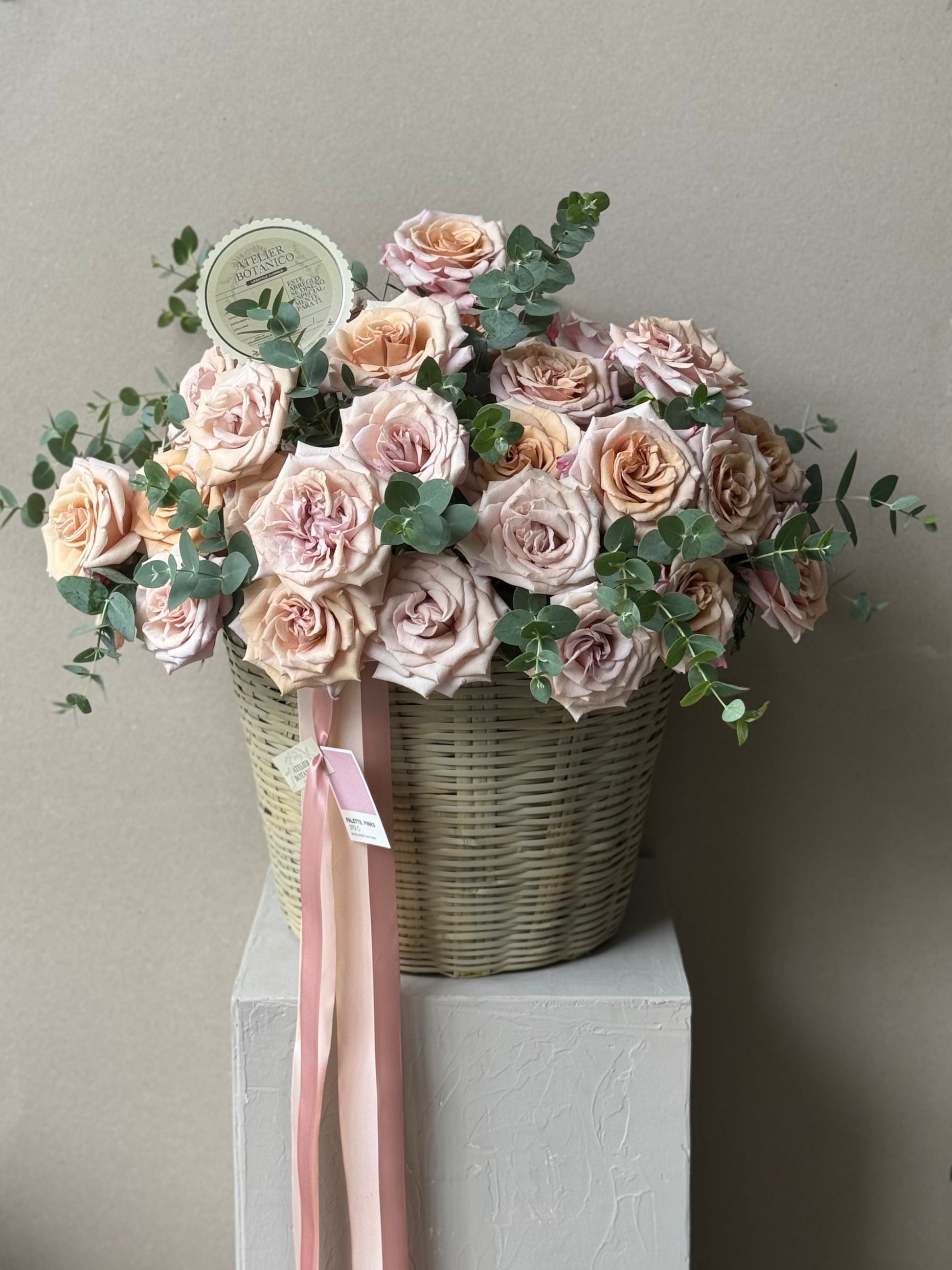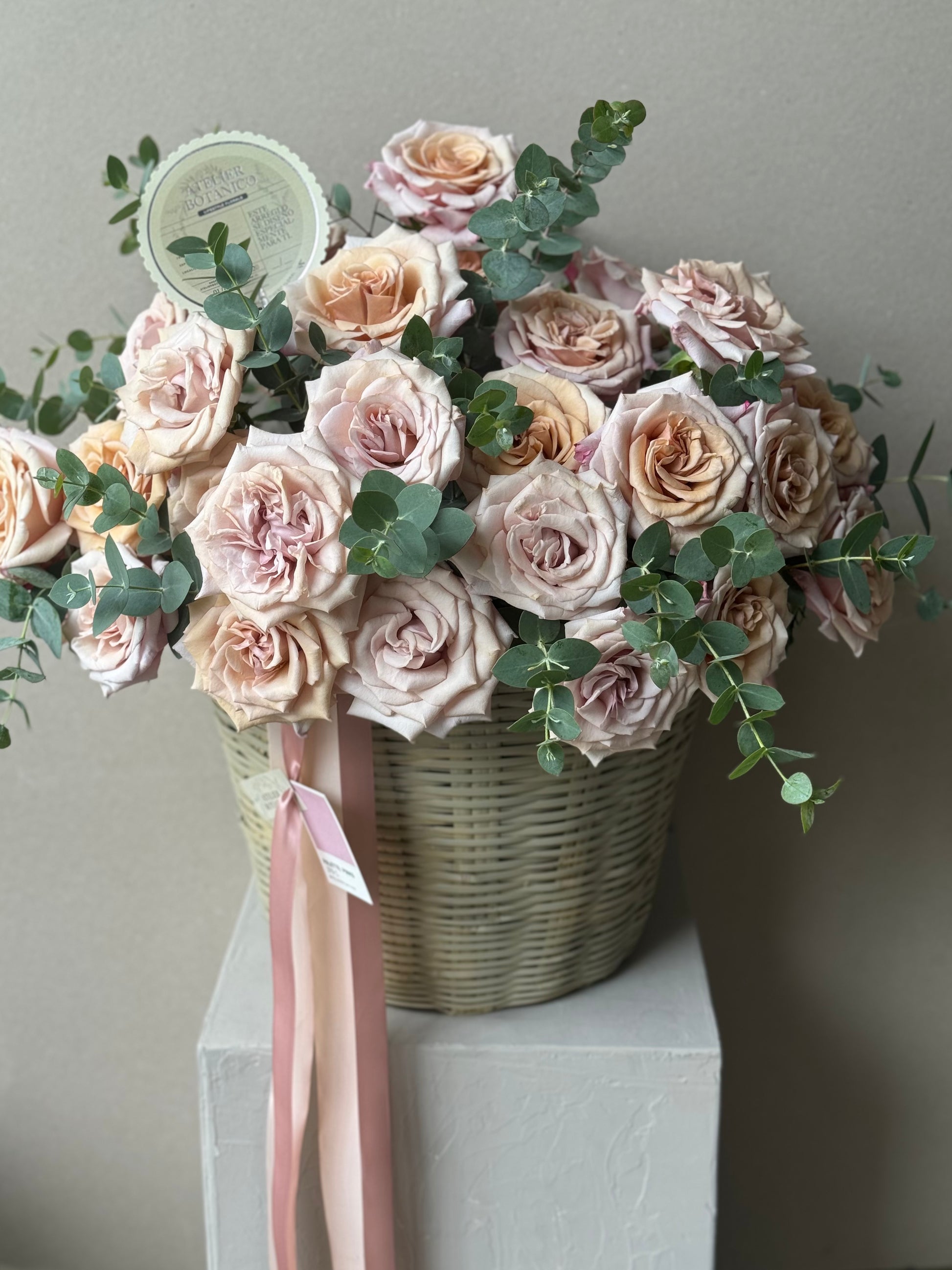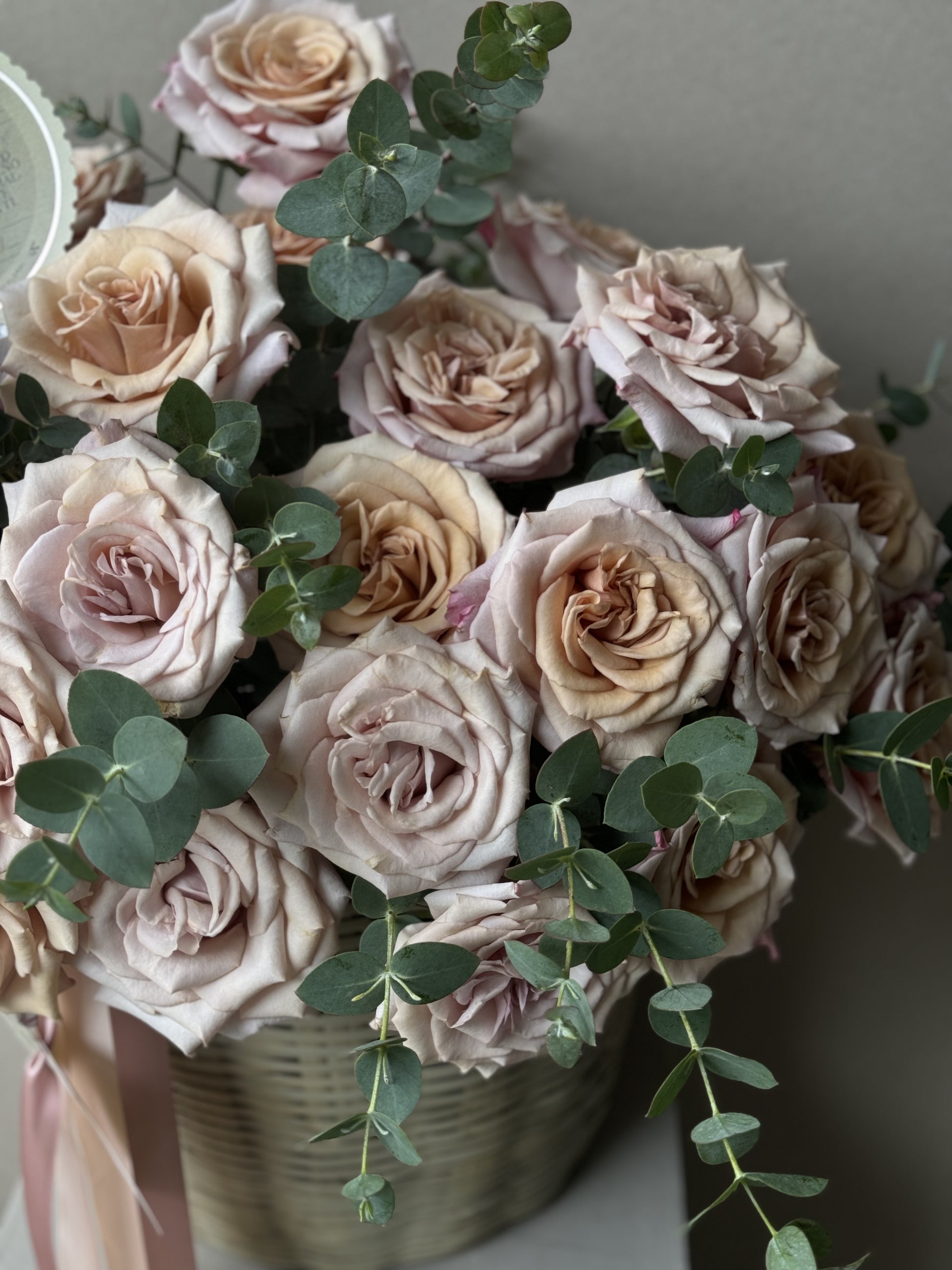 Una composición de 60 Rosas en tonos Malva/Blush con acentos de eucalipto, follajes etéreos y tonos suaves que evocan aire de sierra y belleza suspendida en el tiempo.