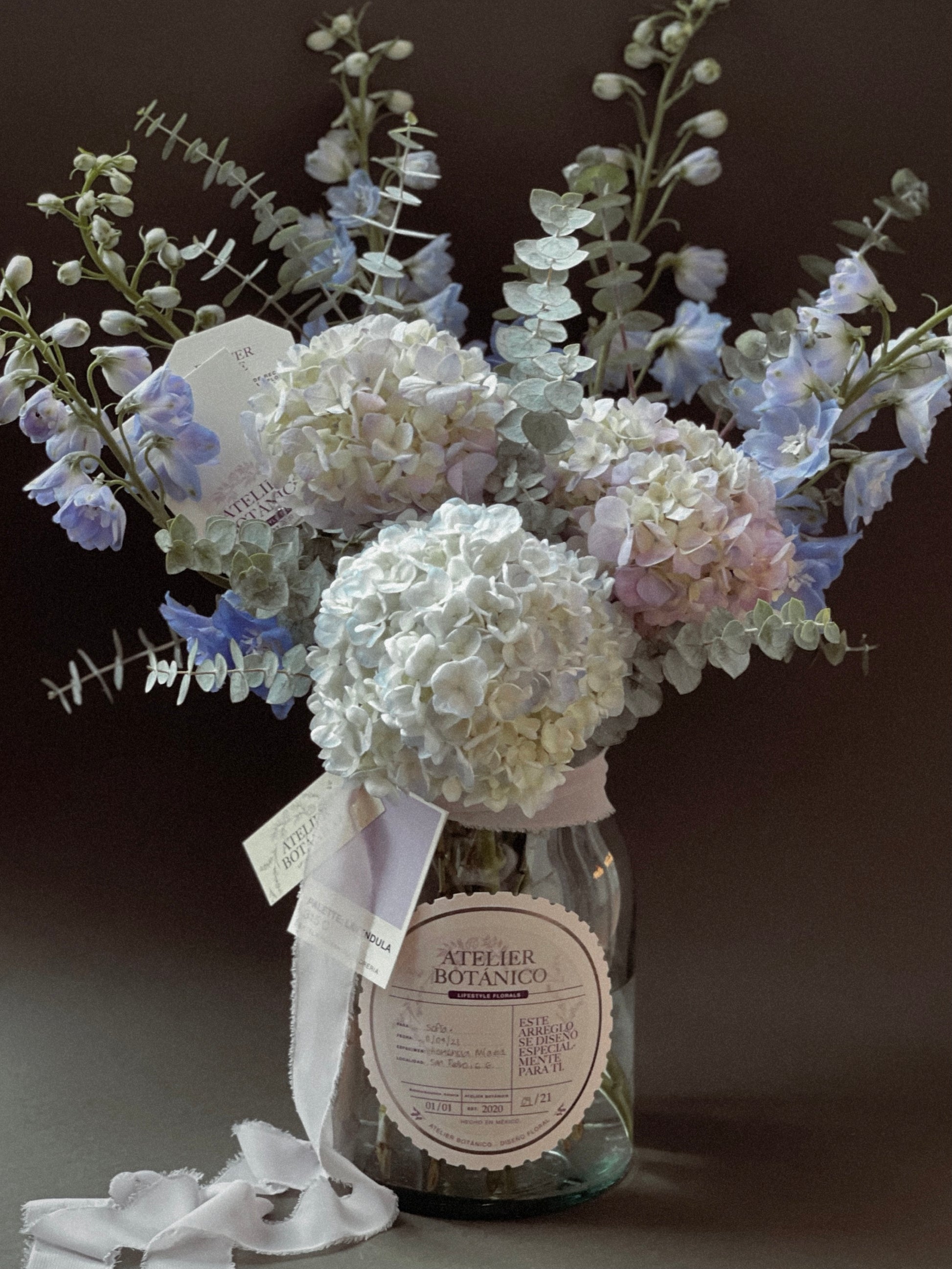 Arreglo de Hortensias y Delphiniums en tonos lilas azulados con acentos de eucalipto en jarrón de vidrio.