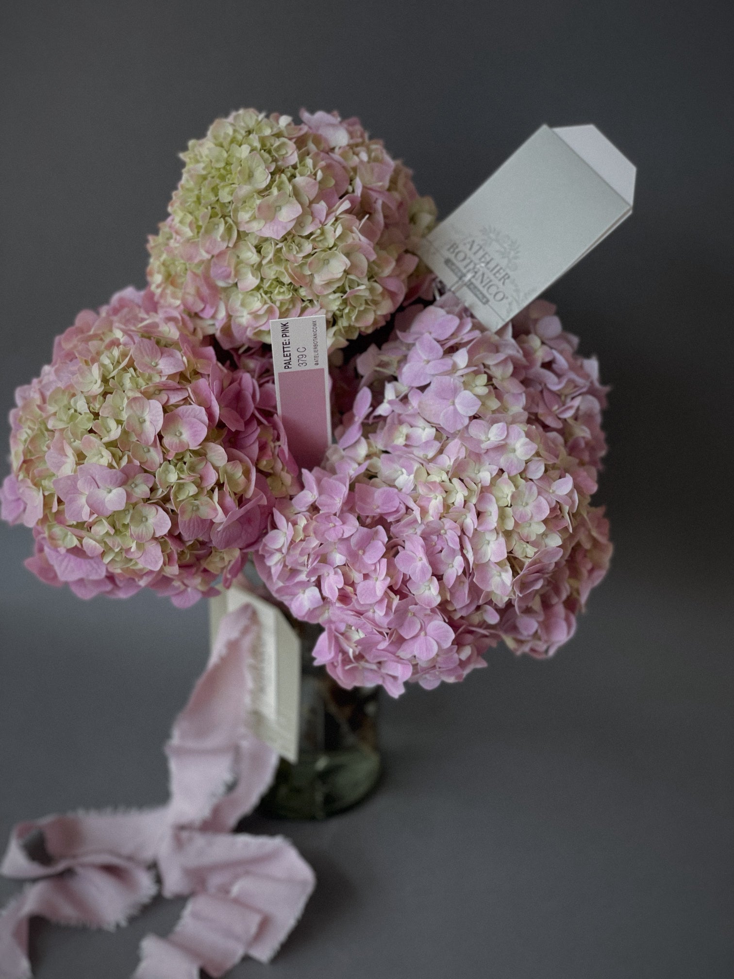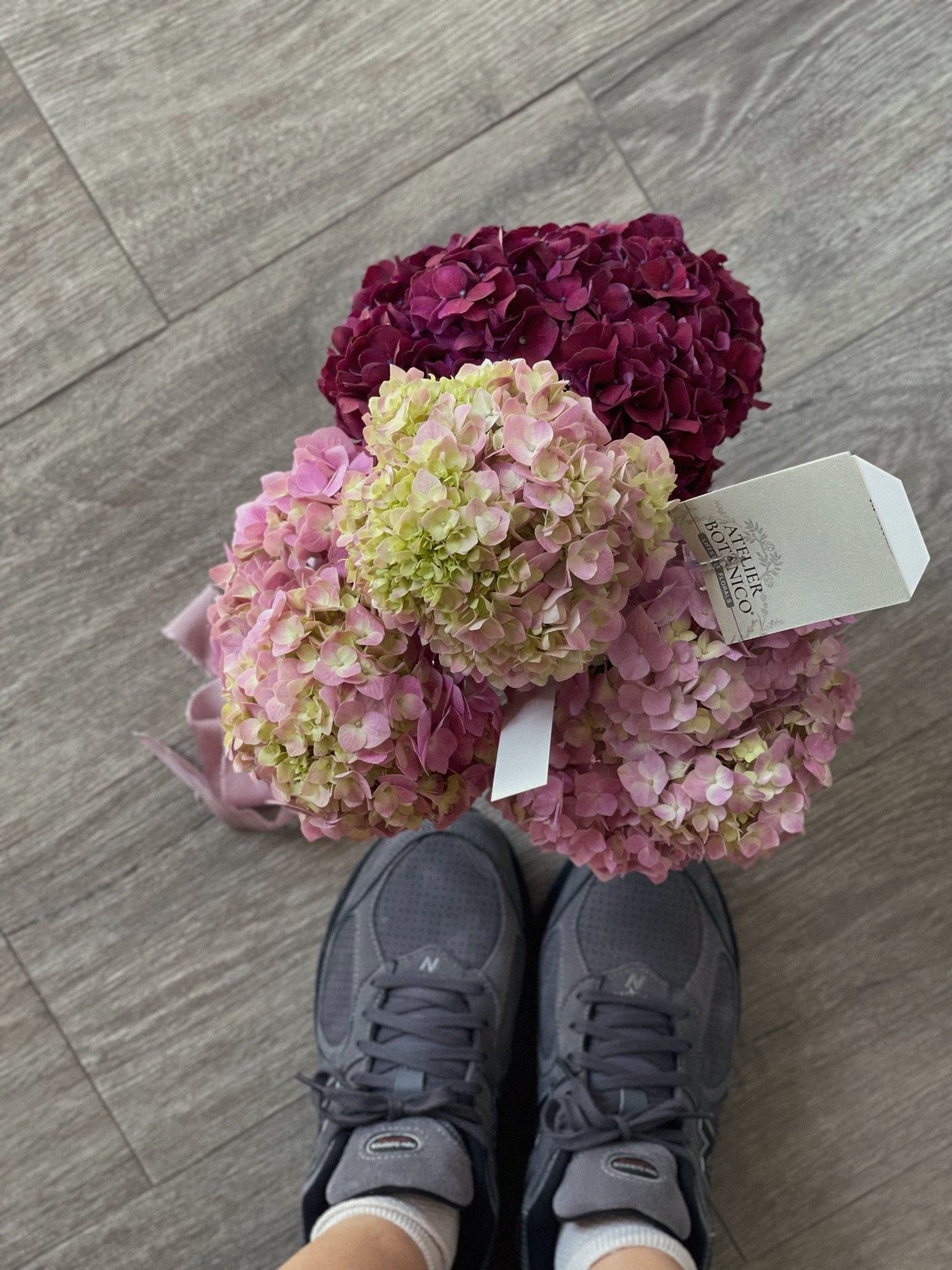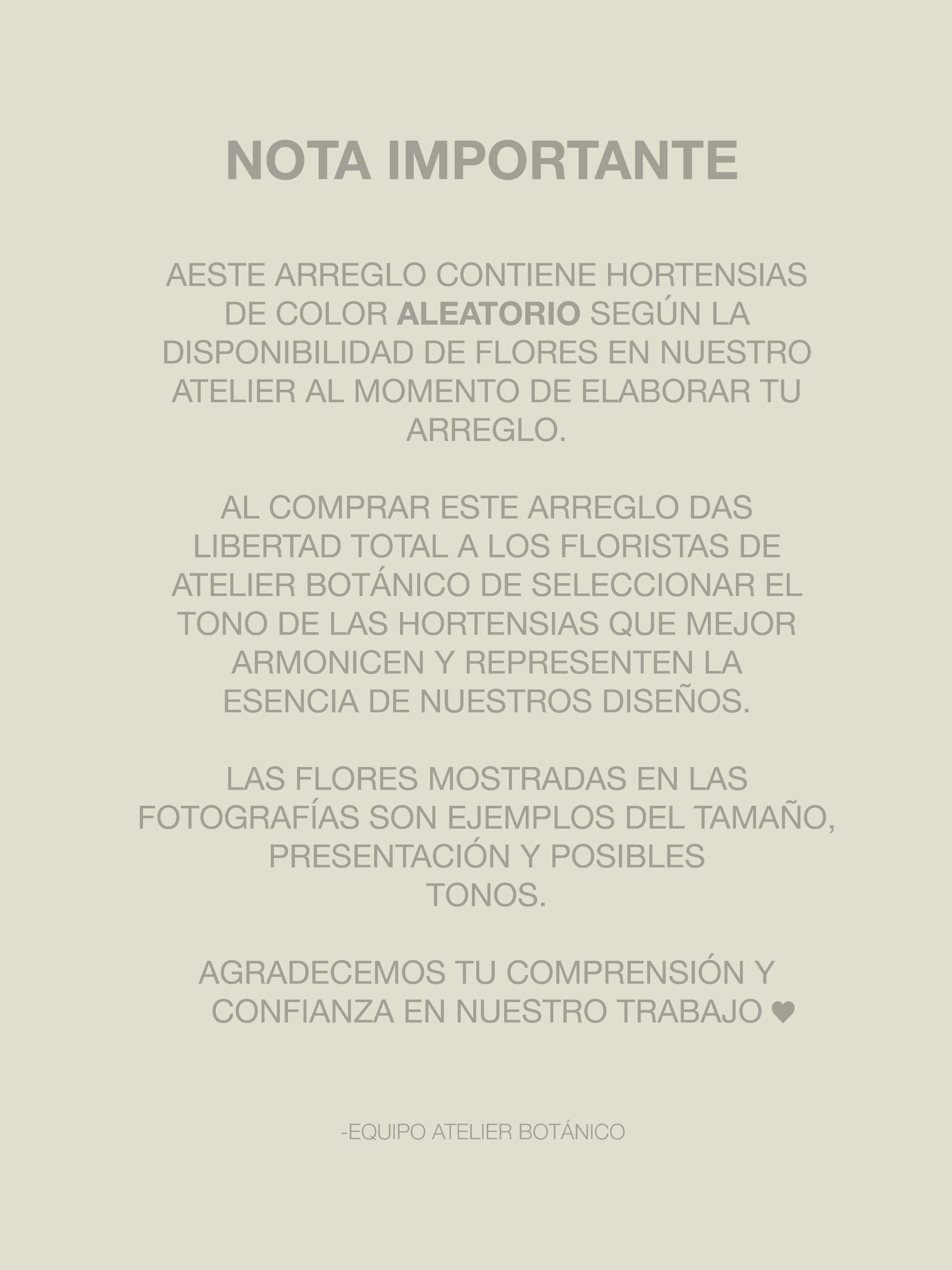 Nota: El tono de las hortensias de este arreglo es parcialmente aleatorio y depende de los tonos de hortensias disponibles enel momento y el criterio de tu florista! Cada arreglo es una sorpresa!