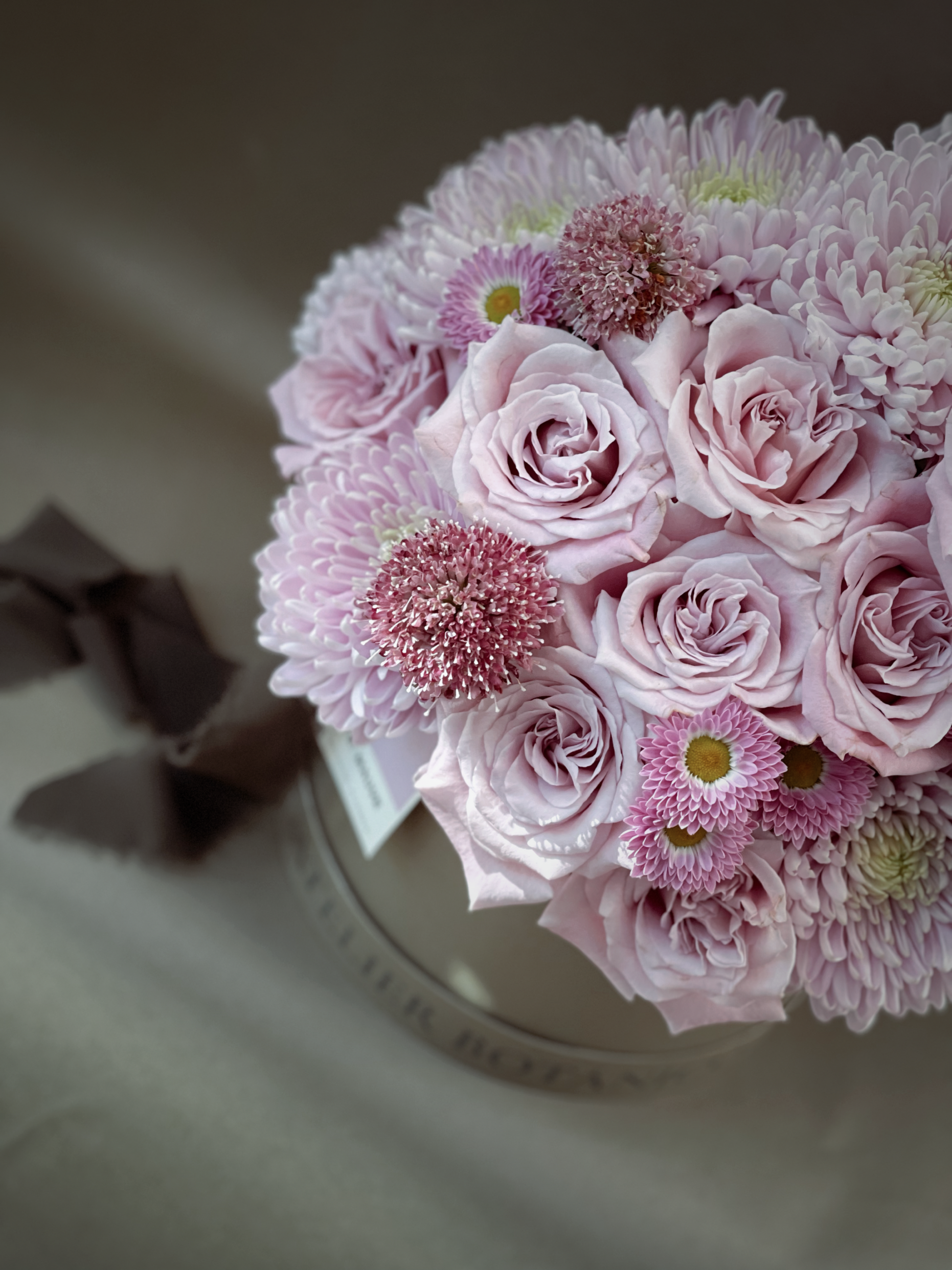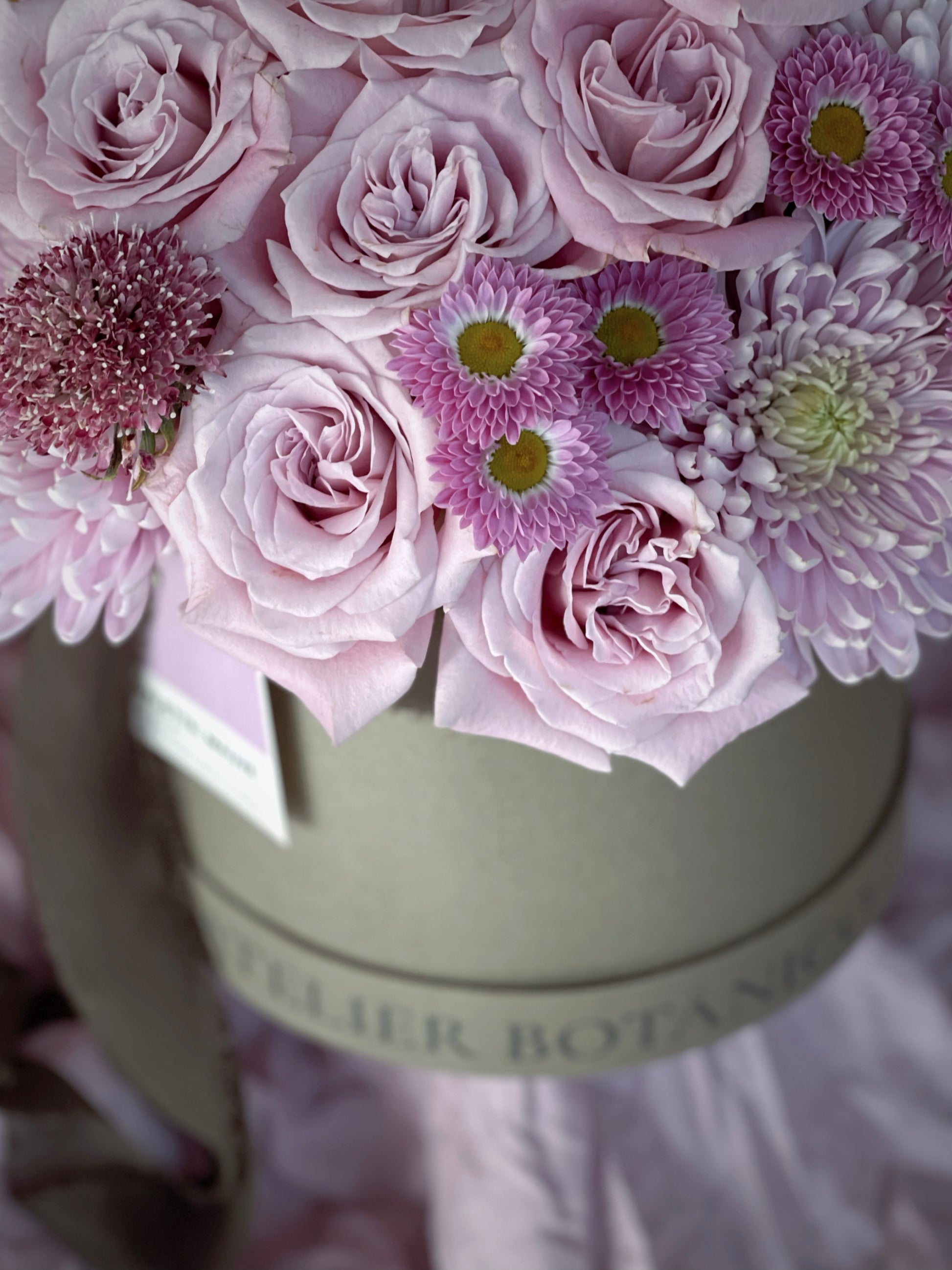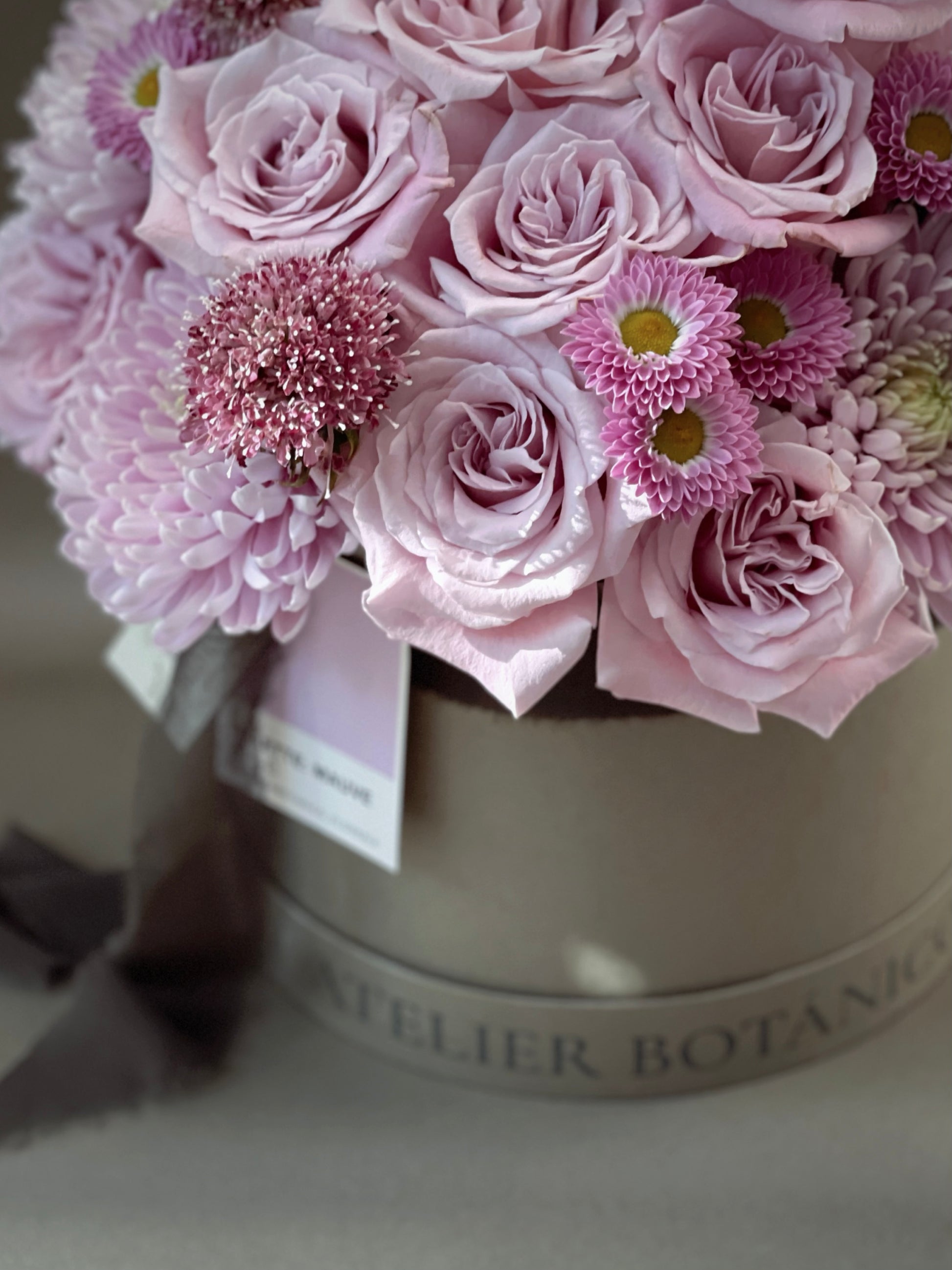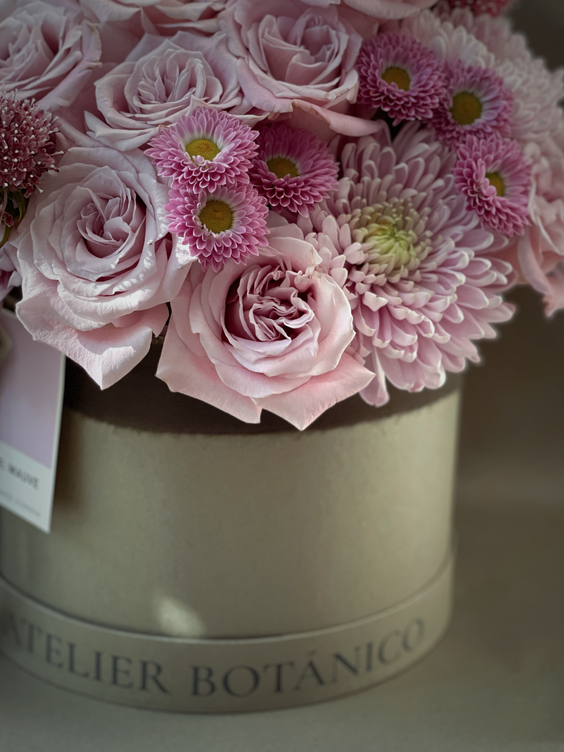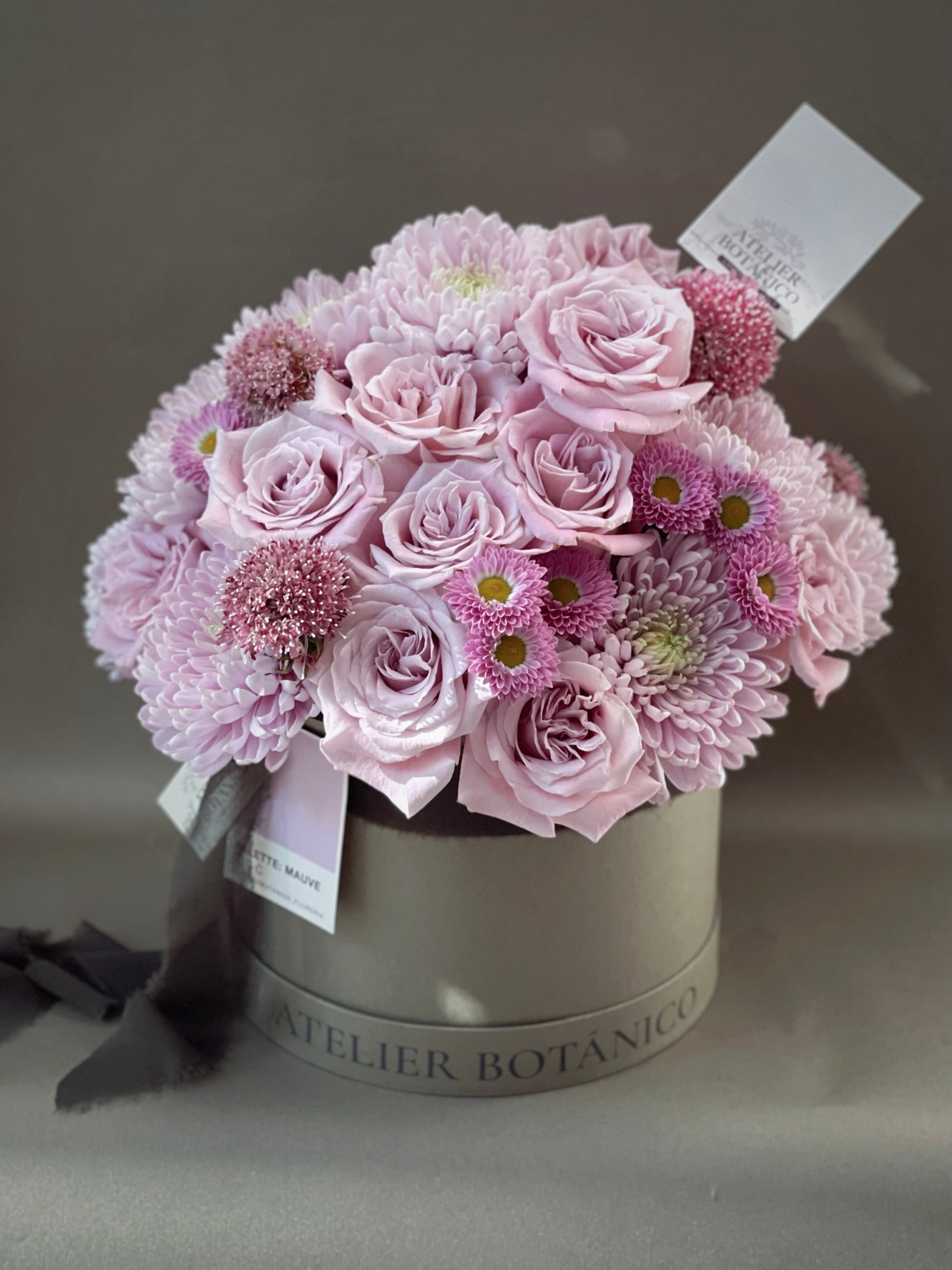 Arreglo de 24 Rosas en tonos Malva y Rosa Pastel con Margaritas y Escabriosas en caja mediana Atelier Botánico.