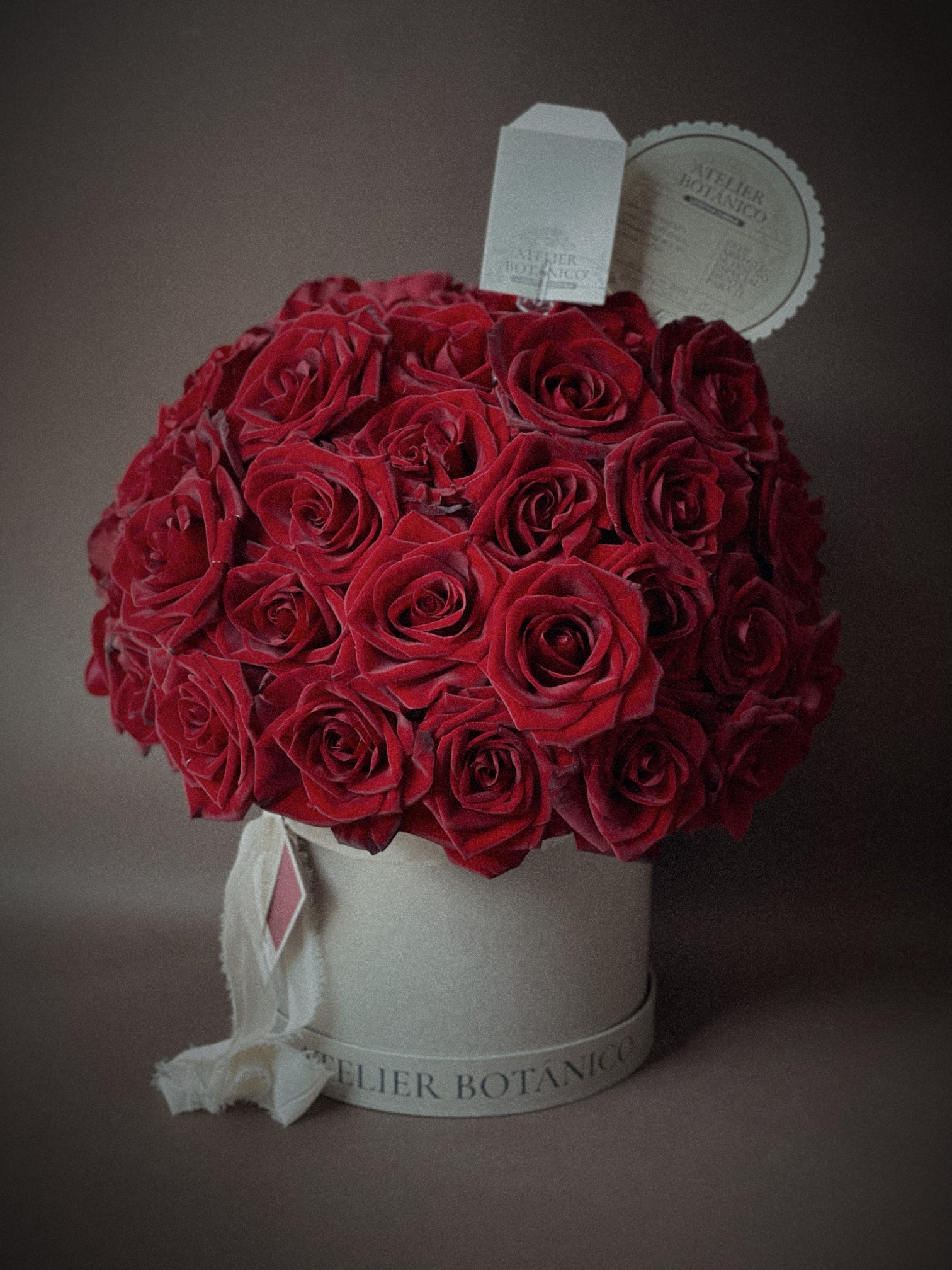 Nuestra selección de Rosas Rojas Aterciopeladas montadas en nuestras icónicas cajas de regalo Atelier Botánico.